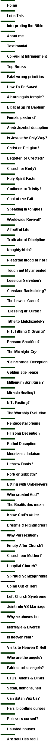 WE REALLY HAVE TO LEAVE, BUT WHEN IS THE RIGHT TIME TO ‘GO IT ALONE?’ Believers from all over the world write to ask, “It is unbearable to go to church because of all the false teaching, lack of truth, real Holy Spirit power, and all the strange spiritual manifestations. We really have to leave, but how will we remain in Christ without the support of a church, seeing that we are part of Jesus’ body, and were not made to worship and follow Him ‘all alone?’” I understand the concern of Jesus’ end-time believers; I am one of them. However, no matter what the enemy uses to scare us into submitting to evil, we can never be alone as long as we remain in Jesus! The temple of the Holy Spirit, the Scripturally born again believers of Jesus, can never be empty. The Holy Spirit constantly indwells them, “even to the end of the world,” (Mt. 28:19-20; 1 Jn. 2:20, 27; Rom. 8:9; Gal. 4:6-7, 1 Cor. 3:16.) Still, I am very concerned about those passionate souls, who, once freed from the yoke of dead church religion, think they may set up their own type of ‘salvation;’ slowly falling into the acceptance and ways of the world. Then, there are those who leave ‘church’ without leaving her diseased doctrines behind. Wherever we take those stinking doctrines, we take Church: the false spirit of Christian [meaning ‘little christs’] religion. Paul warned about submitting to sin when he wrote, “Reckon yourselves dead to sin but alive unto Christ... Sin has no dominion over you [except what you allow it to have,] for you are not under [church or temple laws] but under grace [in Christ.] Shall we sin because we are not under law...? Certainly not! Do you not know that to whom you present yourselves slaves to obey, you are that one’s slaves whom you obey, whether by [gradual sliding away from Christ into] sin leading to death, or of [constant] obedience leading to [eternal] life? [The former we were all once enslaved to, but now we have chosen to follow Christ,] by obeying from the heart the [Scriptural truth through which] we were [completely] delivered. And having been set free [past tense] form the [spiritual position of] sin without God, we became [willing] slaves of righteousness... For the wages, which sin pays is [eternal] death, but the [free] gift of God is eternal life in Christ Jesus...” (Rom. 6:11-23.) Jesus keeps His children from harm and other evil by calling them to remain in Him, Who Is The Truth, (Jn. 14:6.) However, just as salvation, perseverance “until the end” remains a personal choice. Jesus warned in Mt. 24:11-24, “Many false prophets will rise up and deceive many. But he who endures to the end will be saved… And false prophets and christs will show great signs and wonders to deceive... even [truly born again disciples.]” Þ To remain part of that system and reach heaven, we will have to annul all Jesus’ warnings concerning the end-time, which we are now experiencing, (read Mt. 24.) John commanded in 2 John 9-12, “Whoever does not abide in the [truth of] Christ does not have God. He who abides in the [truth of God’s Word] has God. If anyone does not bring this [truth,] do not receive him nor greet him; [as a brother,] for [then you] share in his evil deeds.” This does not mean we can shirk our responsibility to warn others of their error and God’s judgment for unrepentance. It means we cannot fellowship with those who cleave unrepentedly to false teachers, false doctrines, church systems, or any form of sin. Many believers say they stay in church to make a “difference” there. But we cannot change unrepented people; they will eventually change us. Why? Because repentance too, is a personal choice. If that person refuses to listen to the Holy Þ Jesus Himself, when the Hebrew leaders would not accept His truth, said, “’Fill up, then, the measure of your guilt…’ Then He went out and departed from the temple…” (Mt. 23-24:1.) Paul and the other disciples did the same, (Acts 19:8-10.) The bad choices of people make it impossible to remain among them. Once we have done what we can and do not find fruit there, it is time to flee before they convert us to their deceptions and other sins, (Rom. 12:1-3.) Þ God commanded us to flee from unrepented people as far as possible. Ps. 37, “Depart from evil and do good; and live forevermore...” Rev. 18:4, “Come out of her, My people, lest you share in her sins, and receive of her plagues…” Jesus warned, “Not everyone who says to Me, ‘Lord, Lord,’ will enter... heaven, but he who does the will of My Father in heaven. Many will say to Me in That Day, ‘Lord, Lord, have we not prophesied in Your Name, cast out demons, and done many wonders in Your Name?’ Then I will say to them, ‘I never knew you, depart from Me, you who practice lawlessness!’” The entire church system was built on lawlessness. The building itself, the hierarchy of deceived clergy, and all its false dogmas are all imitations of Jesus’ True Spiritual Kingdom, His body of believers, and the Real Truth of His Word, (Mt. 7:21-25.)