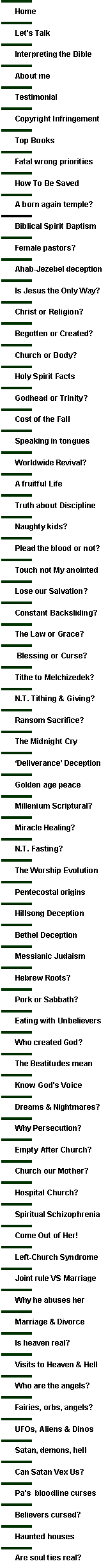 BEFORE PENTECOST WHEN THE HOLY SPIRIT CAME TO INDWELL HIS DISCIPLES, JESUS BREATHED ON THEM John tells of an incident after Jesus’ resurrection, before He sent the Spirit to indwell them at Pentecost, when Jesus miraculously appeared in the midst of His disciples, declaring His Kingdom of inner peace; commissioning His disciples to ‘go and preach the Gospel,’ and breathing “on” them, [not “in” them,] to “receive the Holy Spirit,” (Jn. 20:19-30.) Yet, Jesus’ disciples received the indwelling of the Holy Spirit for the first time on the Day of Pentecost, and “one can only understand this event in John 20 as symbolic and in expectation of that day.” [Spirit Filled Bible 1991 version, Acts 1:8; Gal. 4:4-7.] Þ Still, many preachers from the Pentecostal Charismatic Movement use this event completely out of context, blowing on believers to ‘receive the spirit’ or to ‘baptize them ‘in’ the spirit.’ The truth is that Only Jesus Christ Himself can baptize with His Holy Spirit, or ‘breathe’ His Spirit of Life into, (before His ascension “onto” Jn. 7:39,) the hearts or born again human spirits of believers, (Mt. 3:11.) If any of these so-called clergy spirit-baptized you or breathed on you to receive a spirit, you need to seriously run to God for real Scriptural deliverance! Catholics and Protestants turned Jesus’ first disciples like Peter and Paul into so-called godlike, apostolic ‘fathers’ - even “the foundation of the church” - but only Jesus Himself is the Foundation of His body of true believers. So, they teach that this event in John 20:19-30 was a “special anointing” for the ‘godlike’ apostles. These hyper-anointed clergies of the Charismatic Movement are now the so-called mediating Elijah prophets and apostles - which, of course, do not exist anywhere in the Truth of the New Testament. [Mt. 17:12-14; 11:13-14, KJV, “All the prophets prophesied until John… [and] he is Elijah who was to come.”] This Elijah prophets and apostles dogma is the ‘Restoration’ doctrine — which does not mean restoration to Scriptural truth, but ecumenist or one-world church restoration to the so-called ‘king and high priest’ of Roman Catholicism, the pope and his ungodly god-father priesthood. Concerning John 20:23, where Jesus supposedly stated that He gave “the apostles” the power to forgive sins - it is a well-known fact that the pope of Roman Catholicism and his priesthood use this verse to allegedly ‘forgive sins.’ [See KJV Eph. 1:7; Heb. 9:12-15; Acts 10:43; Col. 2:13-14.] The notion that the first apostles had the power to forgive sins is a Roman Catholic concoction to justify their abuse of God's Holy Word. The reason why such a great error can be found in the Bible, is because the Vatican, who had centuries to meddle with the Scriptures, placed it there on purpose! If Scripture cannot fit into the full contextual truth of the Bible passage and the light of the New Testament, it was placed there. God Himself commanded us to “test all things, [Bible verses too,] to see whether it is of God, (1 Ths. 5:21.) The “Entire Truth” or the whole Bible interpreted in context, is God’s Ever Living Truth, (1 Jn. 4:1-4.) The Matthew Henry Commentary explains John 20:22-23 as follows, “Christ’s Kingdom was to be set up among men immediately upon His resurrection, and accordingly we find [that He appeared to them on] the very day He arose… [giving them] the honorable and ample commission to be His agents in the planting of His [ecclesia, or congregations of disciple-believers.] Then He qualified them for the discharge of the trust reposed in them. He breathed on them and said, Receive the Holy Ghost… IN PART NOW; as an earnest of what you will further receive not many days hence. The SIGN He used to assure them of the GIFT, [which is the Spirit of God Himself, Whom] He was about to bestow upon them at Pentecost, was His breath, [His spiritual life and power,] which they would receive from Him for all the services that lay before them… Christ [and only Jesus Himself] conferred the Holy Ghost… [here by breathing on them in Jn. 20:21-22 as well as at Pentecost,] for He is the Author of the Gift…” the indwelling Holy Spirit.