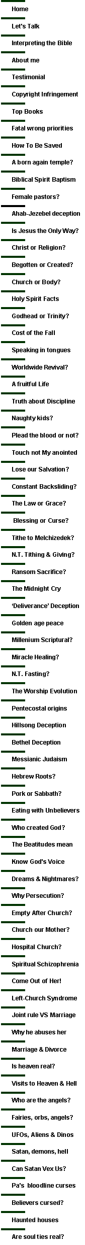 UNSCRIPTURAL HIERARCHY OF ‘RULING’ ‘ELDERS’ The Dreadful Consequences of the Fall in Eden Did God change His Marriage Covenant so we may Divorce at will? GOD’S UNIVERSAL AND SPECIFIC PLAN FOR MARRIAGE PARTNERS ABUSE WAS NOT EVE’S PUNISHMENT THE TWO-PHASE WEDDING CEREMONY AND “LIVING TOGETHER — ‘MARRIED IN GOD’S EYES?’